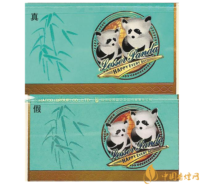 镭射防伪标识差异对比:真烟镭射防伪标识清晰、无漏色,竹叶叶片清晰光滑无条纹,两只小熊猫身上和头顶的毛粗细均匀;假烟镭射标识粗糙模糊,竹叶叶片有条纹状,两只小熊猫有漏色,身上和头顶的毛粗糙不均匀。