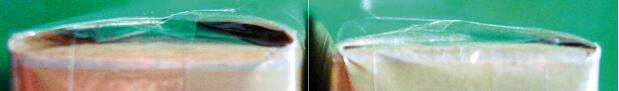 2.看小盒底部包装纸,真烟包装纸折角处呈现弧状,且间隙较大;而假烟的底部包装纸折角处呈锐角,而且间隙比较小。肉眼可直接对比出来。