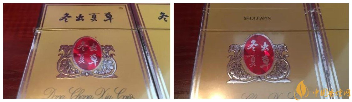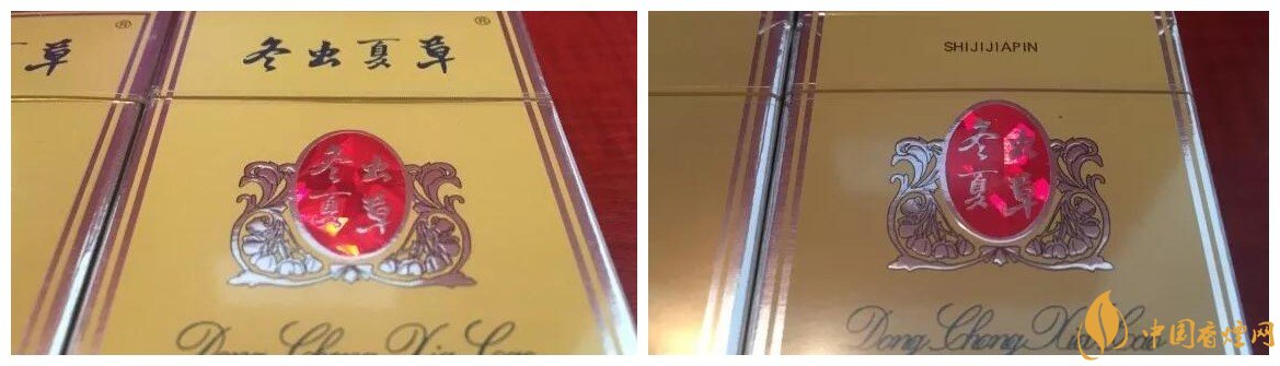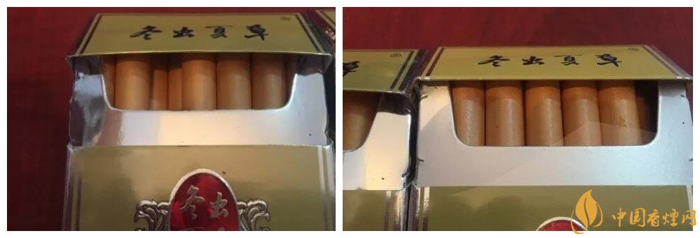 左假右真,烟支努嘴色泽不同,正品颜色偏深,质感好,仿品颜色偏浅;正品冬虫夏草四个字整体比仿品字体大一圈,且正品和仿品“夏”、“草”两字书写上有明显区别。