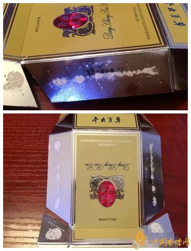 冬虫夏草烟真假鉴别图仿品盒装胶痕细节图