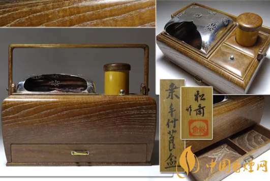 但是这种装饰得华丽的烟草盆只是贵族的爱用品,真正深研茶道的茶人则更爱用朴素简单的桐木、桑木制成的篮式烟草盆。即便是看似简单的篮式,有一些为名家之作,选用昂贵的木材和非凡的工艺,随没有箱式那般华丽,但是往往也价格不菲。