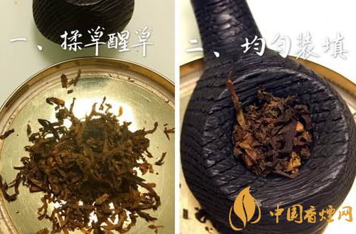 第二:填充烟丝,左手拿着烟斗(可以用右手),斗柄向外,右手拿一些烟丝很轻松的把烟丝放入烟斗,不要压,只能用手轻轻碰一下,反复4-5次以后,一直到用手碰烟丝不会凹下去为止,此时再拿一撮烟丝把它惗紧用力放入烟斗,用大拇指把烟丝压入烟斗然后用大拇指按住烟斗口旋转一周,此时才把烟丝填充完毕。