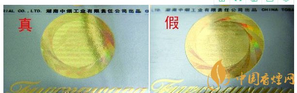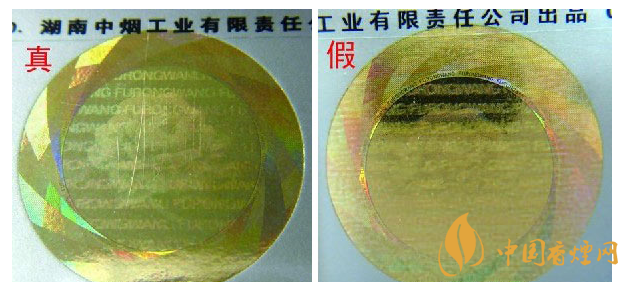 ②迎光观察激光全息图案:真品卷烟图案内拼音字母、芙蓉花及“芙蓉王”转换不同角度,都会呈现不同图案的切换,且层次清晰、字体完整;假冒卷烟无论如何转换角度,都无法达到完美切换,字体模糊,图案缺失严重。