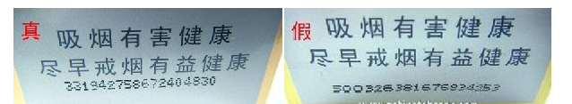 二、小盒背面激光全息防伪技术及电话查询真假差异①平放在桌上,斜角45度观察静止状态下的激光全息图案:真品卷烟图案表面烫金平整、干净,能照射出影像来,且无任何污垢痕迹;假冒卷烟表面印刷粗糙,能明显看出表面定位烫金有脱皮现象,污垢痕迹明显,表面如同铜镜上附着一层雾气看上去较模糊不清。