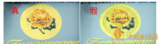 ②正面芙蓉花及拼音字母印刷:真品卷烟烫金颜色均匀一致,色差小,图案中横条线之间线条粗细大小相同,且表面干净、整洁;假冒卷烟烫金套印偏差大,边缘多出现凹凸不平现象,图案中横条线之间大小不一,色差较大。