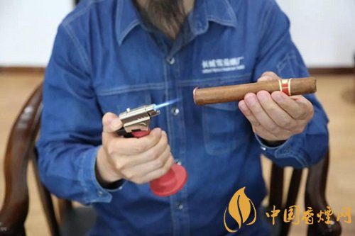 单手45°持茄,火焰正对雪茄端面,尽量靠近但不触碰,转动雪茄,到端部变黑即可停止,过分点燃会导致雪茄苦涩。