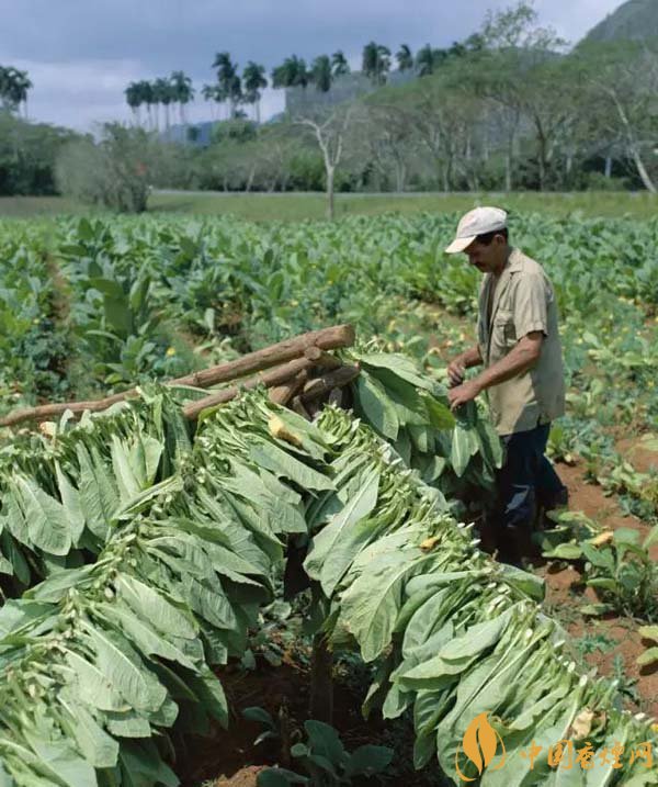 所以仓库的技工们把烟叶晾在最接近地面处,然后因其阴干的速度,慢慢的、一层一层的,向仓库的高处及深处移位,最后为了要调校至适合发酵的湿度,一排一排的烟叶又会再度往下移。整个过程历时60天。正是因为这种追求天然真实的工序,使古巴雪茄的外皮叶上留下了绿斑。