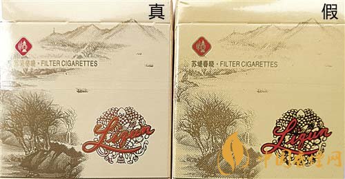 真品商标纸采用胶印印刷,中间“利群”文字及拼音采用压凸烫金工艺,用手摸凹凸感明显,“苏堤春晓”主体图案颜色较深;假烟采用高清扫描仿制印刷,中间“利群”文字及拼音用手摸无凹凸感,“苏堤春晓”主体图案颜色较淡,商标纸整体颜色偏黄。