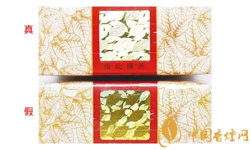 真烟采用镭射防伪,立体感强,防伪内叶片中的叶脉清晰;假烟的镭射防伪立体感不强,整体看去较杂乱,防伪内叶片中的叶脉较模糊,与真品特征存在明显差异。