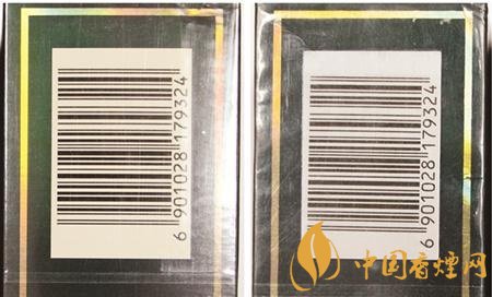 烟用包装膜材质及条形码对比:真品卷烟条包装膜材质光滑,均匀无皱褶,条形码区域呈淡黄色,套色均匀清楚。假烟条包装膜材质粗糙,有不均匀皱褶,条形码区域为白色,套色边缘放大后模糊不清。