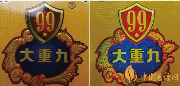 二、小盒商标印刷工艺差异比对真品小盒商标纸正面印刷工艺以蓝色为底烫印“大重九”字样,边缘采用精雕细刻雕版烫金技术,套色烫金均匀完整;假烟小盒商标印刷采用“扫描照相”等仿制技术,套色烫金严重失真,商标图案呈现出的效果与真品商标图案差异明显。(左真右假)