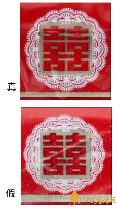 真烟“囍”字体红色色彩均匀,白色花型图案的线条较清晰;假烟“囍”字体红色色彩深浅不一,字体边缘锯齿状明显,白色花型图案整体较模糊。