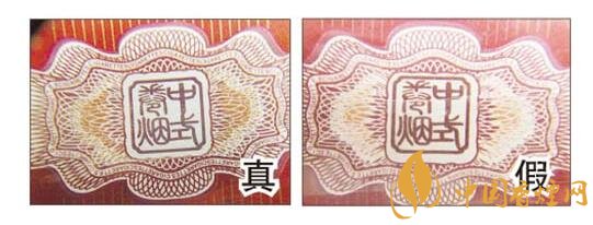 真烟烫金字体线条清晰、不漏金,金色部分成色纯正;假烟烫金字体线条不清晰,有漏金现象,金色部分成色暗淡。
