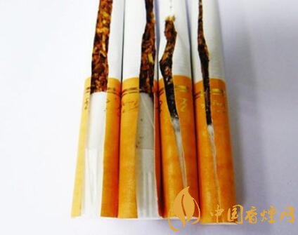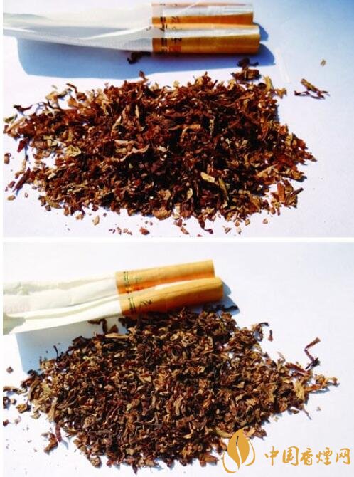 真品烟丝切丝宽度均匀一致,烟丝油润性好,有弹性,颜色呈金黄色;假烟烟丝切丝工艺粗糙,宽窄不一,含大量劣质烟梗片,烟末含量多,颜色呈褐色,与真品烟丝结构存在明显差异。