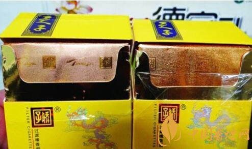 真品小盒正面套印定位烫金“飞龙”图案鳞片清晰,从头至尾都能看到定位烫金工艺,红色贯穿整个龙身,“鳞片”是雪里透红,栩栩如生;假烟套印定位烫金仿制较差,鳞片无法达到真品的印刷工艺水平,印刷工艺与真品商标图案差异明显。