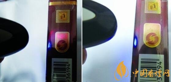 真品小盒在验钞灯的照射下,防伪区立刻呈现出红色“丰和”两个字,关闭验钞灯又能复原防伪区;假烟在验钞灯的照射下,防伪区无任何变化,与真品存在明显差异。