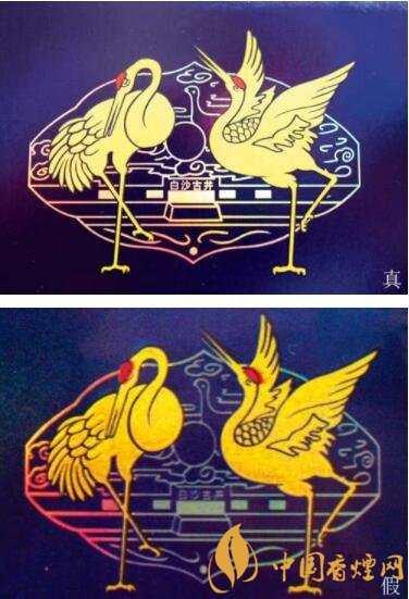 真烟的logo印刷套色分明,图案上的鹤嘴尖部上长下短,头顶部红黄色层套色均匀细致,眼睛栩栩如生,“白沙古井”字体粗细一致、饱满,整体未见颜色图层重复、错位情况;假烟的logo印刷颜色死板,图案上的鹤嘴部上下长短几乎一致,鹤头顶部红黄色层套色有明显错位,眼部线条粗细不一、且因套色错层导致眼睛看上去无神,“白沙古井”字体粗细不一、印刷线条偏细,颜色图层有重复、错位情况。