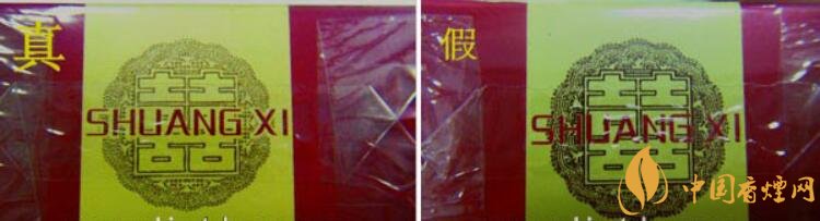 真品商标纸颜色为深红色,正面喜字烫金边缘有凸起感;假烟商标纸颜色多为鲜红色,正面喜字为平版印刷且边缘未见凸起感,与真品存在明显差异。