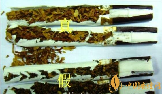 真品烟支采用二段式生物降焦滤嘴,烟丝颜色为金黄色,切丝宽度均匀一致;假烟多采用单一的普通滤嘴,烟丝颜色多为褐色,与真品存在明显差异。