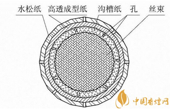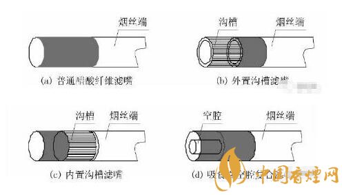 滤嘴现在主要的结构沟槽滤嘴:是一种由于特殊结构的沟槽纯纤维纸包囊醋酸纤维丝束滤芯制成。简单来说,就是在醋酸滤芯的外围先包覆一层沟槽纤维素纸,然后包裹一层成形纸而成。沟槽纤维素纸的表面是通长的沟槽段或者是沟槽段和平坦段组合构成。其作用一方面可以有效减小吸阻提高通透感。另一方面增大烟气与滤嘴的接触的表面积,快速降低烟气温度和增加对烟气有害物质的过滤和吸附。