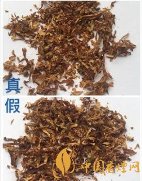 真品卷烟烟丝呈金黄色、丝条状,内含膨胀烟丝,香气绵柔;假烟烟丝呈棕黑色,含末量大,香精气味浓烈。