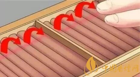 将雪茄放在湿度稍大如地下室之类的地方约一星期(如果雪茄特别干燥,可适当延长时间)。而后将雪茄放置在湿度为70%的保温盒内,每隔2-3天翻转四分之一(90度),直到全部旋转两次。
