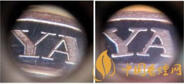 4.YUNYAN拼音字母。真品卷烟金腰带顶部YUNYAN拼音,笔画内有横线条痕迹。该款假冒卷烟字母笔画内无横线条痕迹。图4左真右假