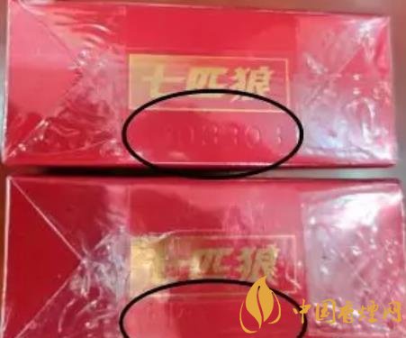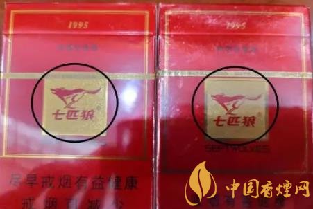 1、商标纸上的“七匹狼”商标图案:真烟套印准确,烫金饱满,色泽鲜亮,图案生动,立体感强。假烟烫金套印容易出现错位,烫金处会出现漏金现象,颜色相较真烟暗沉,立体感差。(左真右假)