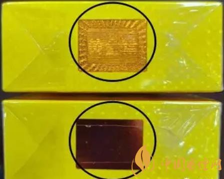 3、烟盒顶部防伪标识:真烟在不同角度可见黄金叶文字与图案相互变换。假烟未能显现真烟防伪标识的效果,或者文字与图案层叠无法清晰分离。(上真下假)