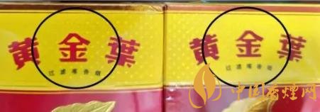 2、正面翻盖处“黄金叶”文字:真烟“黄金叶”三字立体感强,用手触摸有凹凸感。假烟字体无立体感,手摸无凹凸触感。(左真右假)