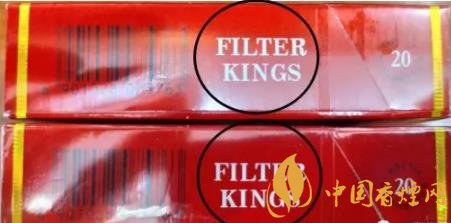 2、侧面英文“FILTER KINGS”:用紫外灯照射真烟“FILTER KINGS”后,移开紫外灯,照射处字体会由黑色逐渐褪色。假烟无此效果,或变色效果差。(上真下假)