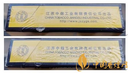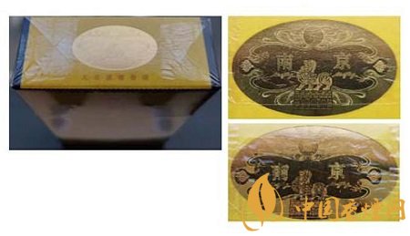 假冒卷烟:该款假冒卷烟南京字体边缘金色轮廓线和笔画内无小圆点,字体笔画颜色暗淡,烫金套印有偏差。(上真下假)
