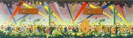 而贵阳烟草公司出品于上世纪50年代的“祖国”烟标(图4),主版采用明快色调,描绘出了新中国成立后人民当家作主的喜悦之情:只见各族人民身着节日盛装,在彩球飘飘、五颜六色的射灯光柱直射天空背景衬托下,聚集于天安门前的华表周围,在撼天动地的鼓乐声中载歌载舞,尽情地欢庆新中国的诞生。