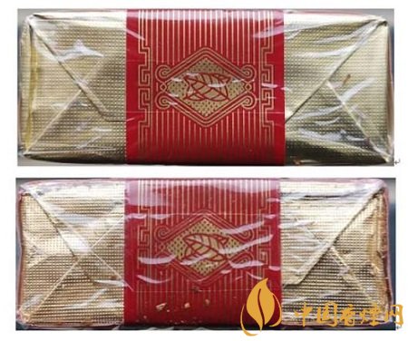 假冒卷烟:1.透明纸烫封收缩杂乱、死板,水汽较重。2.商标纸拐角折叠紧实,无空隙。(上真下假)