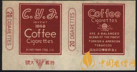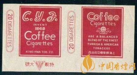 这张烟标在白底色上做文章,正标上是深赭色长方框,正标两旁印有两个红双线两端弧形的长方框,内写有红色“20 CIGARETTES”,即为20支一包的卷烟规格。副标印有咖啡的英文单词,其下一个向上半开的花边圆弧框内有个白色圆圈,圈内是竖写的中文字“咖啡”,字体很小,不仔细看难免忽略。副标下半部分则有一段全英文产品介绍“ARE A BALANCED BLEND THE FINEST TURKISH & AMERICAN TOBACCO”,译为“该产品平和掺入了一流的土耳其和美国烟草。”底部为中文字“锦华烟厂出品”。“Coffee Cigarettes”英文字占据了整张烟标的大部分空间,绝对夺人眼眸。