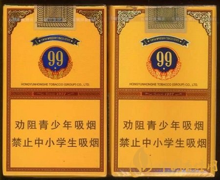 假烟:1.横幅图案边框偏白色,底纹无网格状。2.中间“99”图案,色彩无明显过度效果,整体偏黑色。