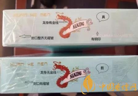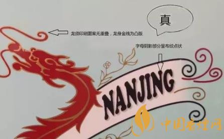 看条盒颜色,真烟为淡蓝色,颜色柔和纯正;假烟为浅蓝色,视觉上颜色不是自然色。看条盒图标,真烟“南京”二字字体端正清晰,龙须印刷图案无重叠,龙身金线为凸版,条盒金边无毛刺;假烟“南京”二字字体向左微倾,龙须有叠痕错层,龙身颜色为褐红色、金线为凹版,条盒金边有毛刺。
