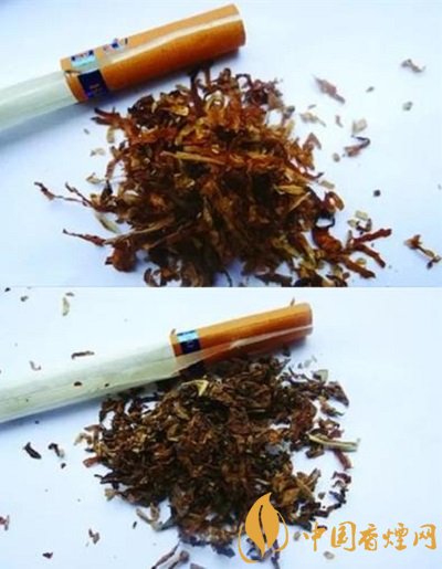 真品烟丝以精选国内外自然醇化两年以上的优质烤烟为原料,切丝均匀一致,颜色均为金黄色,叶丝比例高;假烟烟丝多为劣质烟叶经过化学药剂催化加染加工而成,烟丝表面多存留一些白色香精粉末,烟丝颜色多为褐色,与真品特征存在明显差异。(上真下假)