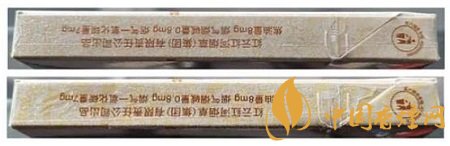 假冒卷烟:该款假冒卷烟烟支长度为97mm,滤嘴处也有四排打孔,但不透气。卷烟纸颜色呈现暗灰色,眼观或手摸烟支松,烟支端部空头严重。烟丝较碎,有烟筋,烟丝色差较大。(上假下真)