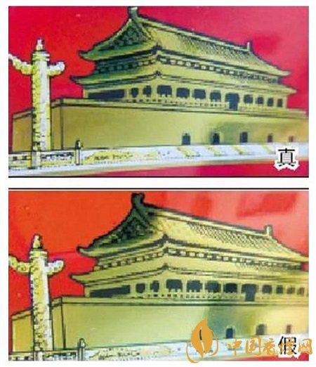 真烟天安门左侧华表套色均匀,黄白色分布有明显分界点,边缘光滑、干净、清晰;假烟套色较差,黄白色不明显,黄色部分印刷较分散,字体边缘套印有毛渣点,呈现锯齿状。