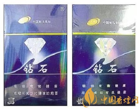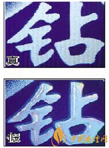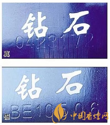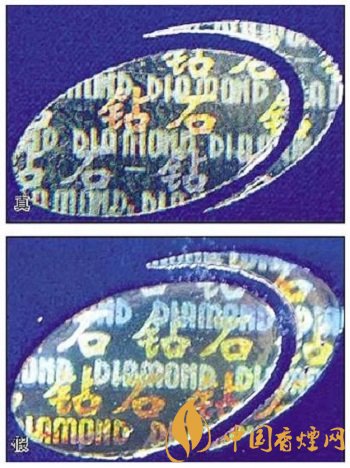 真烟钻石图案印刷清晰,色彩感强,内有微缩英文字母“DIAMOND”,图案无凹凸感;假烟印刷不清晰,用手摸上去有凹凸感。