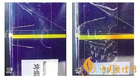 真品卷烟商标纸用的是激光卡纸,转动角度可以看到五彩斑斓的光柱移动效果,商标纸底纹为竖线条;假冒卷烟商标纸采用的是普通卡纸,无彩虹效果,商标纸底纹无竖线条状纹路。