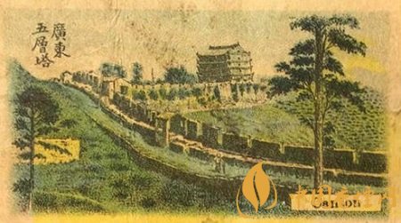 浙江杭州龙江塔何时始建暂时无考,从画面上可以看出是一座七级八面的精美古塔。可惜,现在这座古塔已荡然无存,我们也只能从这张小小的烟画上来领略这座古塔的风韵。