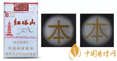 真品卷烟:红塔印刷采用凹印,颜色交界边缘有锯齿痕迹;红塔图案红色与浅黄色印刷清晰。
