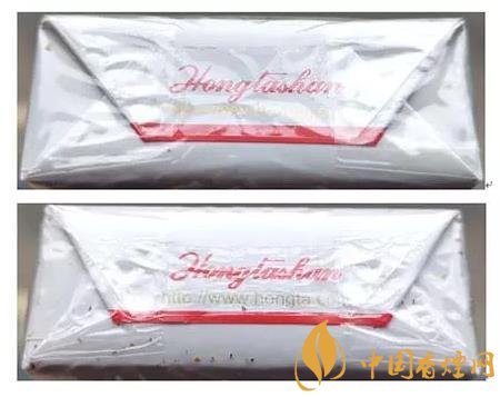 假冒卷烟:1.透明纸烫封收缩杂乱、死板,水汽较重。2.商标纸拐角折叠紧实,无空隙。(上真下假)