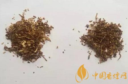 真品卷烟烟丝呈金黄色、丝条状,香气绵柔;假烟烟丝呈棕黑色,含末量大,香精气味浓烈。