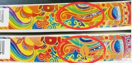 如下图标示,此处图案真烟为蓝色,假烟则变成了绿色;真烟的线条为黄色,假烟变成了红色;真烟为绿色的圆珠外面为蓝色的底色,假烟都变成了绿色。(上假下真)