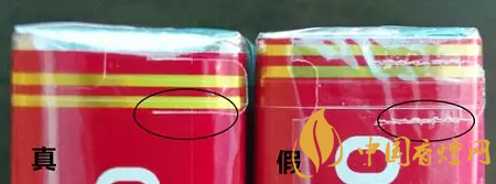 真品小盒拉带头为方头圆角,边缘光滑无毛渣;假烟小盒拉带头形状为平头圆角,边缘不够光滑,有毛渣。