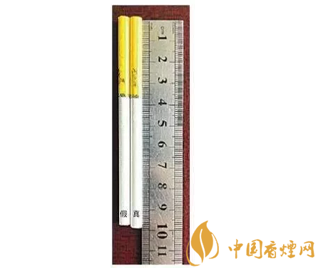两相比较,真烟的烟支明显比假烟的烟支长。(左假右真)