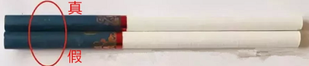 真品卷烟的拉线头是半圆形的,由于真品卷烟采用机器烫封一次成型,封口比较平整;假冒卷烟的拉线头呈不规则形状,一般采用手工电烙铁烫封,封口起皱不平。
